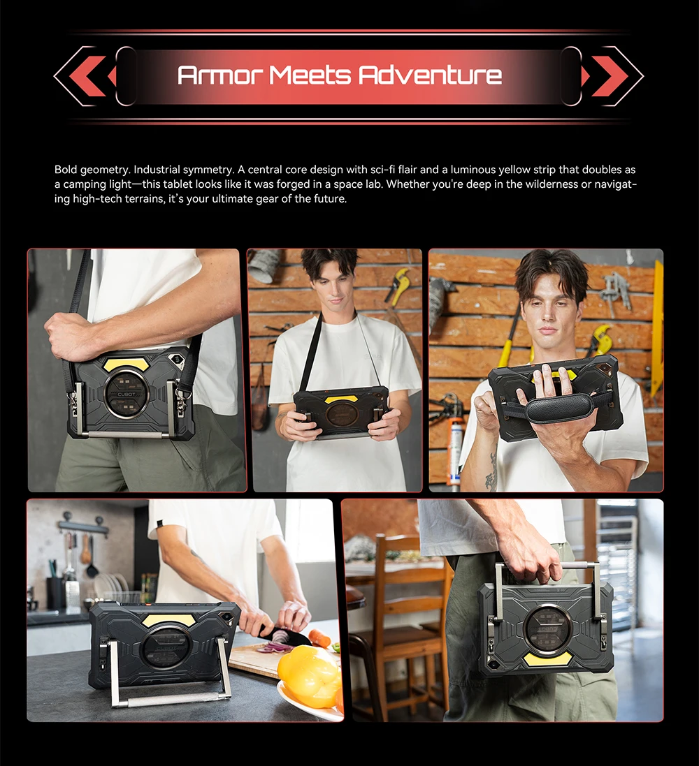 Geometria ousada.Simetria industrial.Um design central com estilo de ficção científica e uma faixa amarela luminosa que funciona como uma luz de acampamento - este tablet parece que foi forjado em um laboratório espacial.Esteja você no deserto ou navegando por terrenos de alta tecnologia, é o equipamento definitivo do futuro.