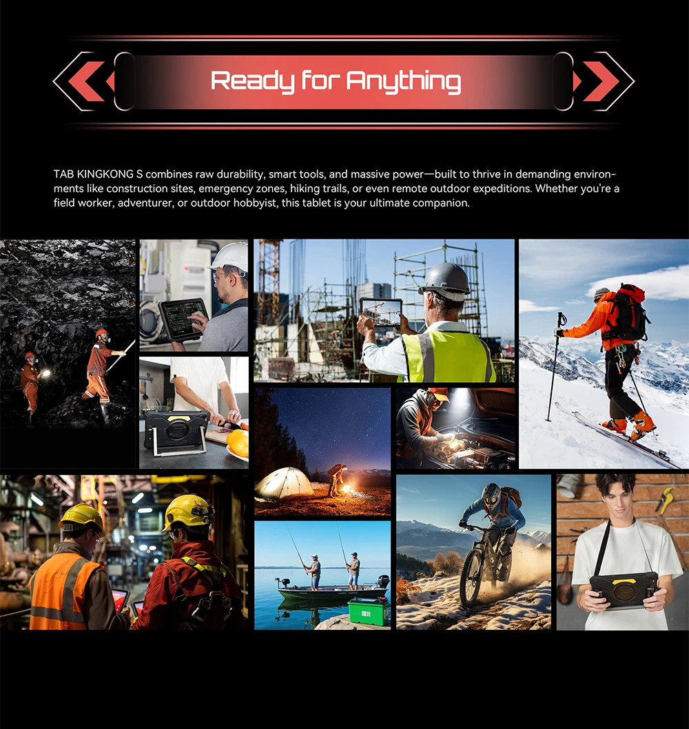 A TAB KINGKONG S combina durabilidade bruta, ferramentas inteligentes e energia enorme - construída para prosperar em ambientes exigentes, como canteiros de obras, zonas de emergência, trilhas de caminhada ou até mesmo expedições externas remotas.Quer você seja um trabalhador de campo, aventureiro ou hobby ao ar livre, este tablet é o seu melhor companheiro.