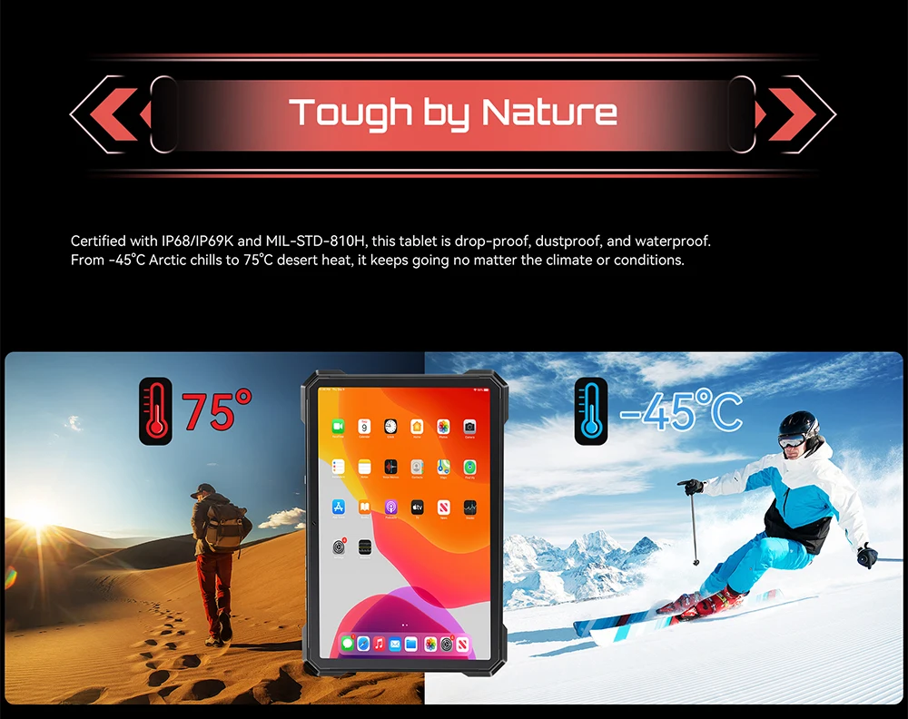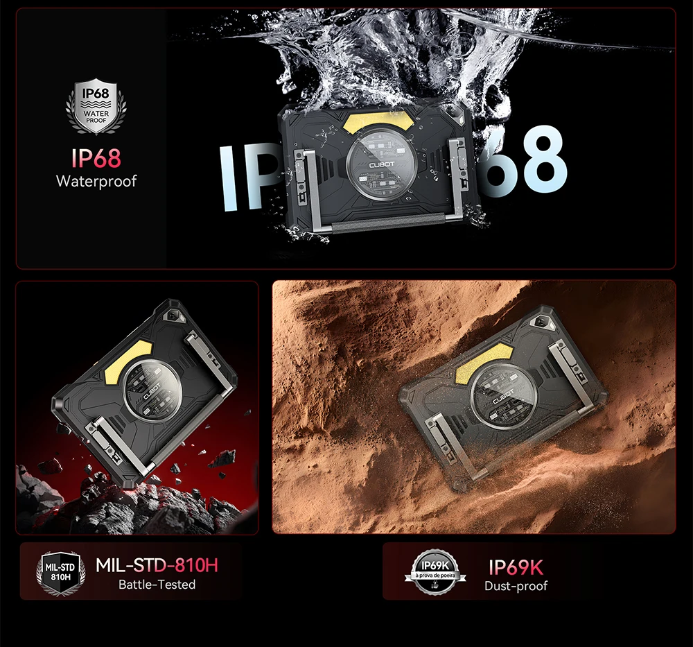 Certificado com IP68/IP69K e MIL-STD-810H, este tablet é à prova de quedas, poeira e à prova d'água.