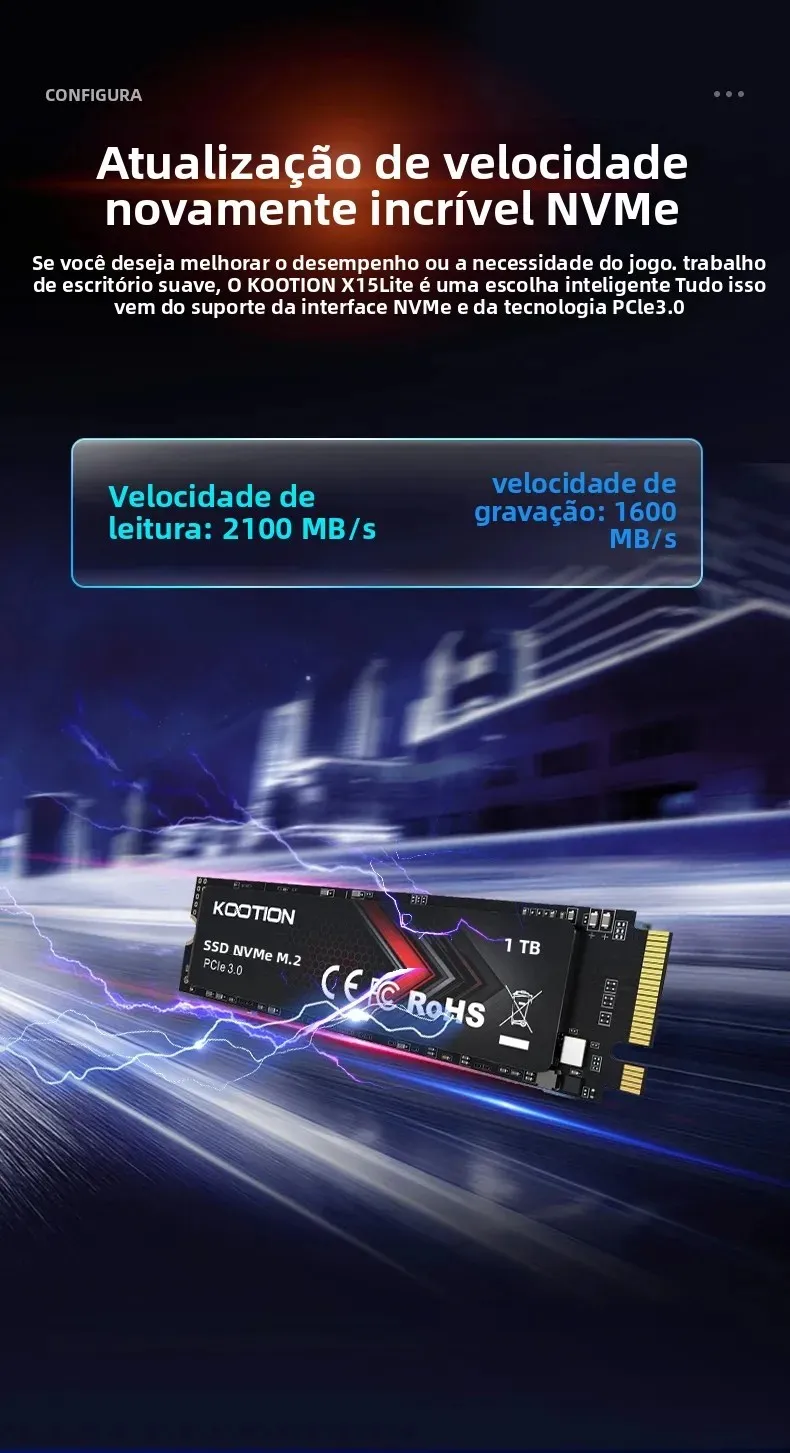 1TB: Velocidade de leitura: 1900-2100 MB/s, velocidade de escrita: 1400-1600 MB/s