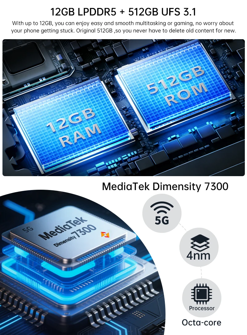CPU: Dimensity 7300 (5G) Octa-Core 2.0-2.6 GHz