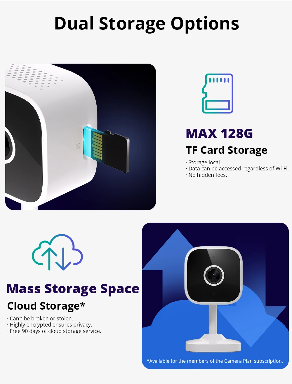 Cam Slim gen2 suporta máx.Armazenamento em cartão Micro TF 128G e armazenamento em nuvem em massa.Você pode assinar o plano da câmera para desbloquear recursos exclusivos para aprimorar a experiência do seu Cam Slim Gen2.