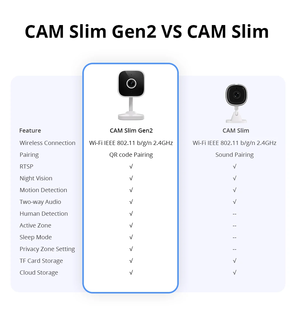 Em comparação com o Cam Slim, o Cam Slim Gen2 apresenta avanços inovadores em alertas de precisão e privacidade pessoal, projetados para elevar a experiência de segurança a um novo nível de sofisticação.Você pode aumentar a precisão da sua câmera personalizando zonas de movimento para excluir áreas acionadas frequentemente, reduzindo assim o número de notificações falsas de movimento positivas.Com a detecção humana habilitada, o algoritmo Al garante a câmera grava e alerta somente quando o sensor detecta uma pessoa.Ative o modo de suspensão para desligar o monitor e proteger sua privacidade sempre que necessário.Permitir zonas de bloco personalizáveis permitem excluir áreas específicas de serem gravadas.Por exemplo, você pode filtrar sua cama enquanto registra as zonas necessárias.Não há necessidade de se preocupar com vazamentos de privacidade.