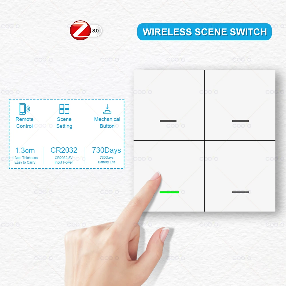 【Automação inteligente】Automação inteligente do interruptor de cena sem fio ZigBee para qualquer dispositivo inteligente no Smart App para definir várias cenas para sua vida inteligente.Toque para executar para obter outro controle mais fácil para todos os dispositivos inteligentes com uma tecla no switch.Cada botão interruptor pode satisfazer múltiplas necessidades, realizando cenas diferentes.Imagine a ligação inteligente para criar um espaço infinito com o switch de cena de fio.