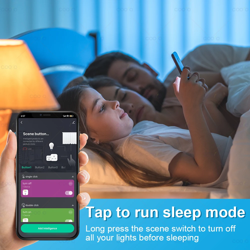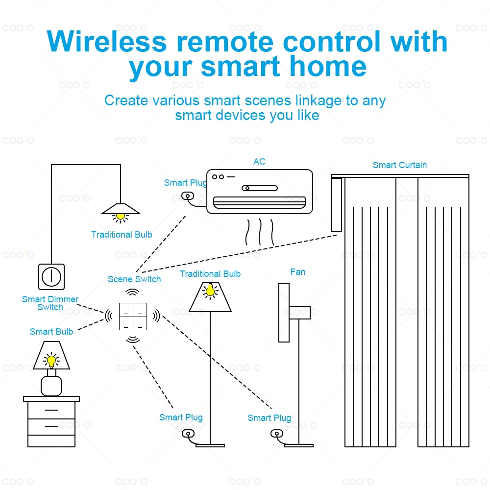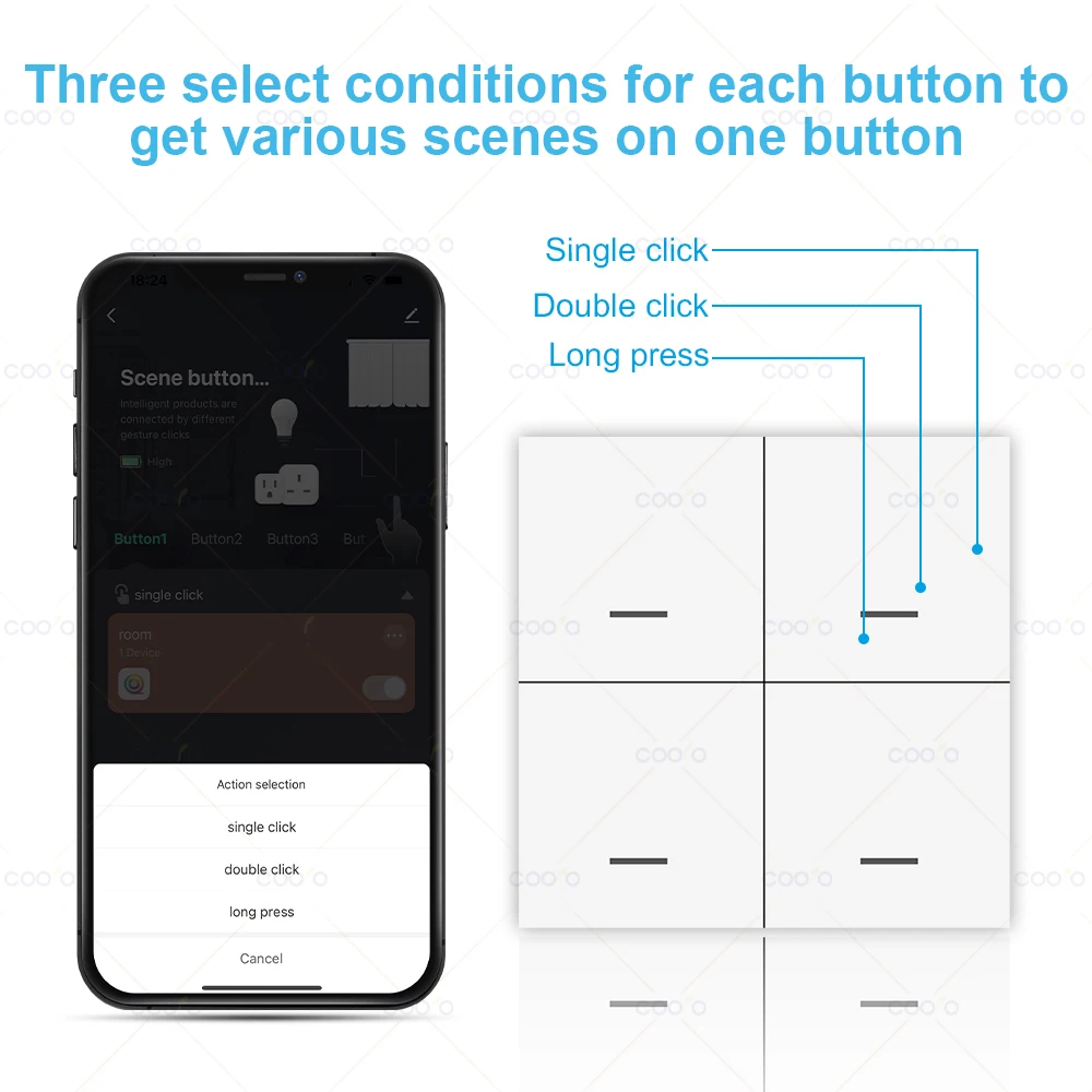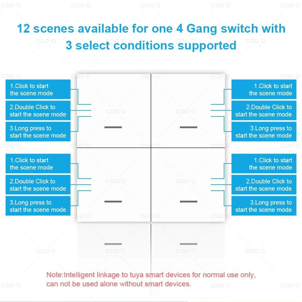 【Modo de 4 gangues e 12 cenas 】 Três modos de emparelhamento para cada botão para obter 12 cenas de um interruptor de cena de 4 gangues, como modo ausente, modo inicial, modo de filme, etc.Para criar qualquer automação inteligente como desejar no aplicativo do seu smartphone para iniciar seu outro estilo de vida inteligente, não é necessário mais comando de voz, chega de tempo para abrir seu aplicativo, apenas um toque é necessário, quando você está cansado de um dia de trabalho.
