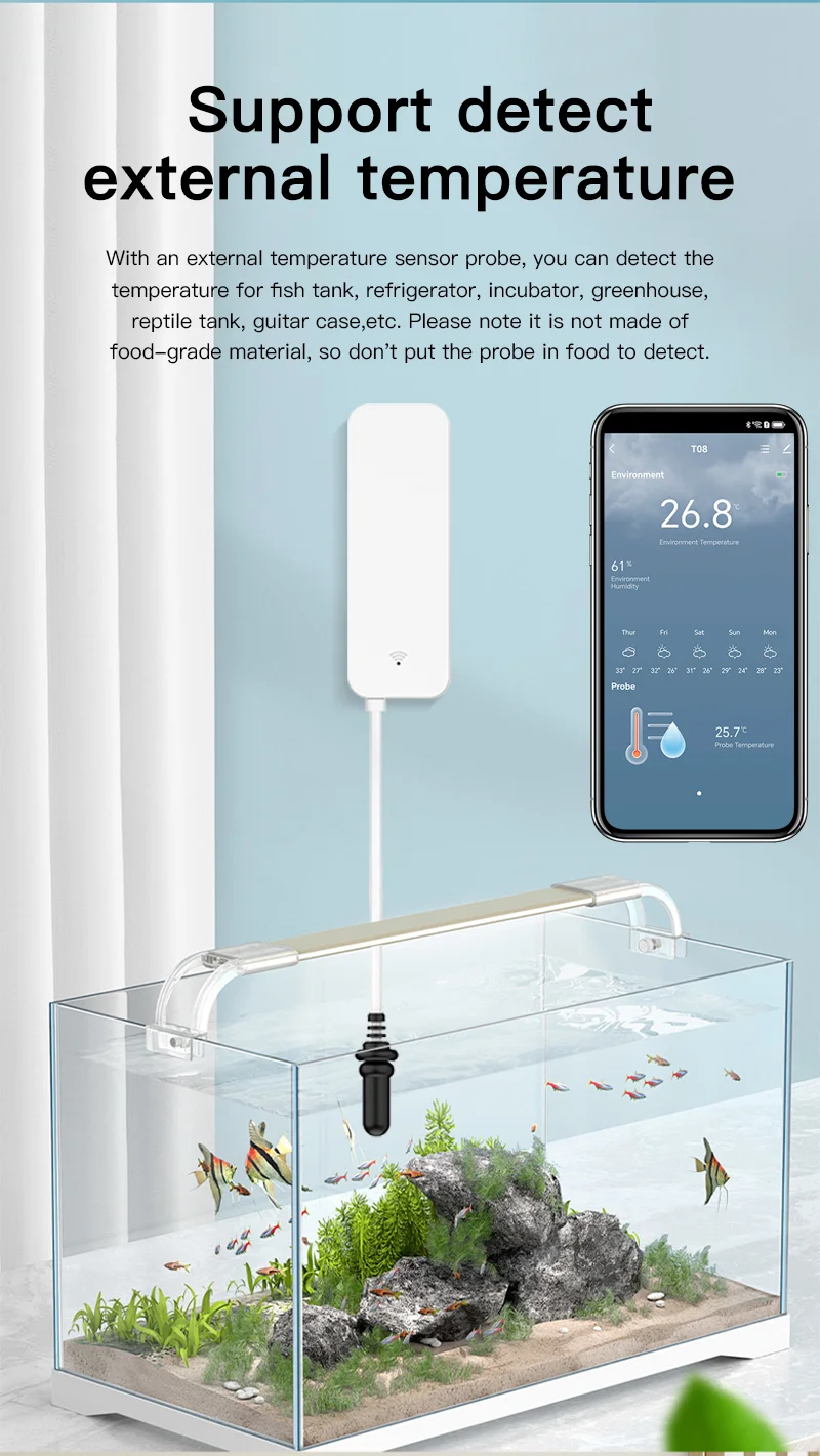 The sensor will report when the temperature and humidity. You can view the changes in the value on the APP or display screen.Record the temperature and humidity changes on the APP, and use the graphics to show you.