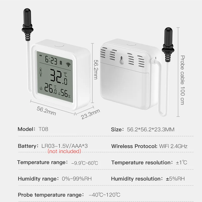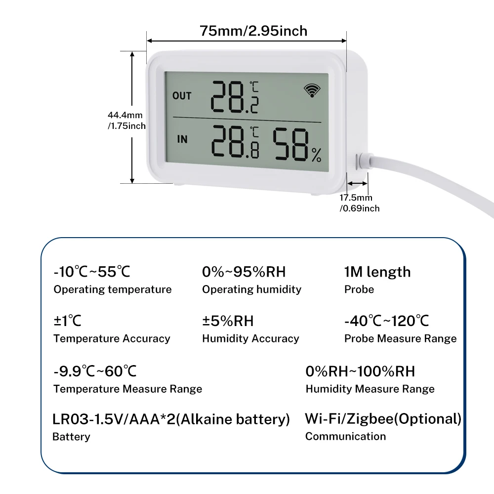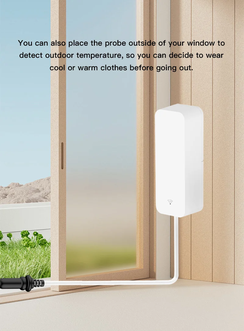 External sensor, with a wire length of 100cm. Temperature measurement range -40 ℃~120 ℃.
