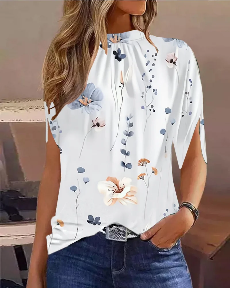 Blusa feminina com estampa gradiente verde, camisa feminina elegante com gola em O, blusa manga curta, moda vintage, solta, design xale