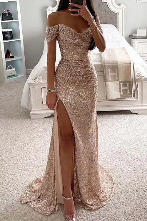 O vestido apresenta um luxuoso design de lantejoulas, adicionando um toque de glamour a qualquer evento.É perfeito para quem quer se destacar na multidão.