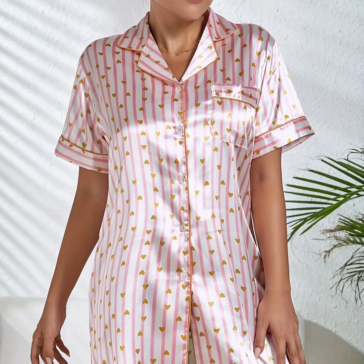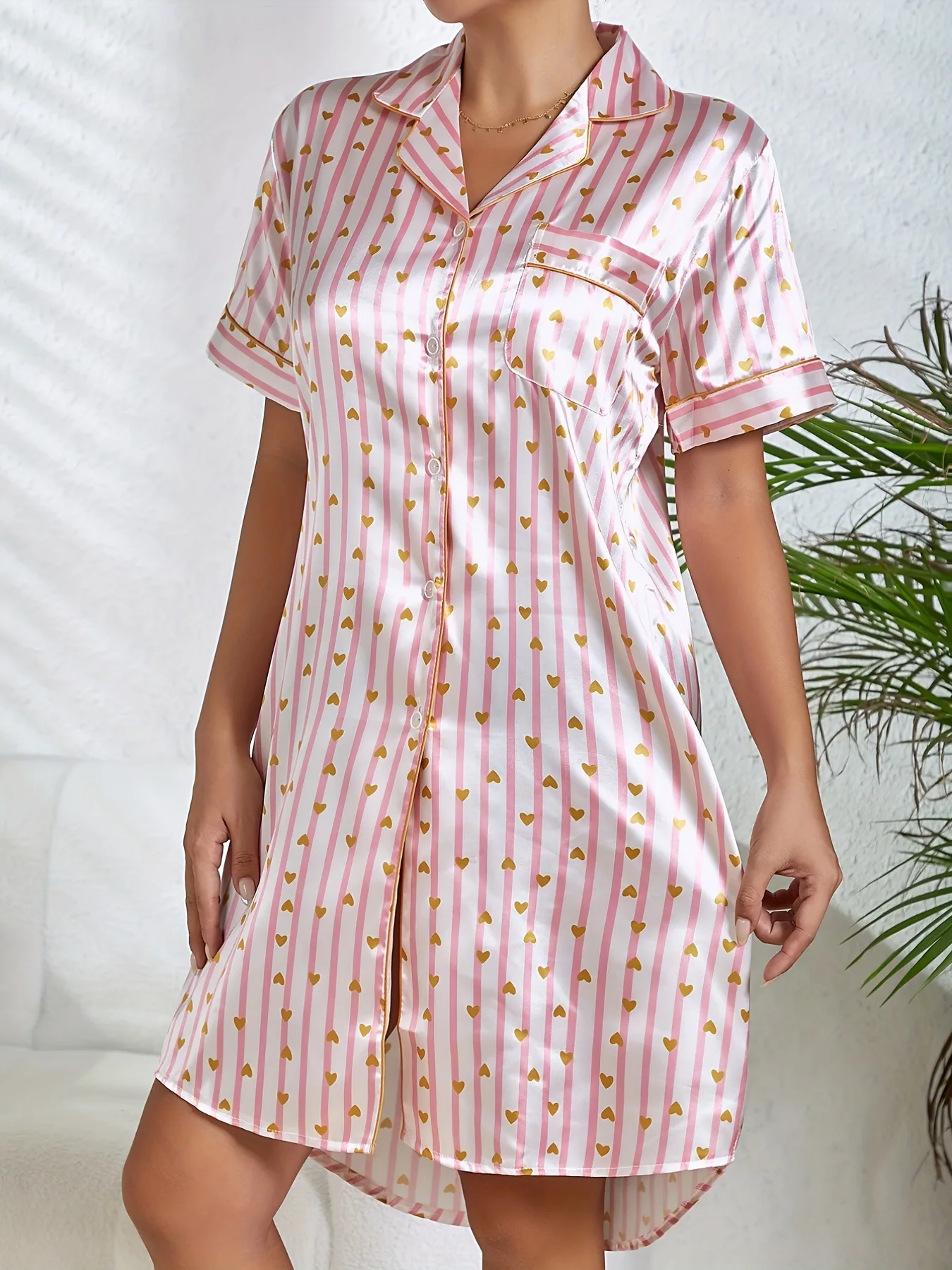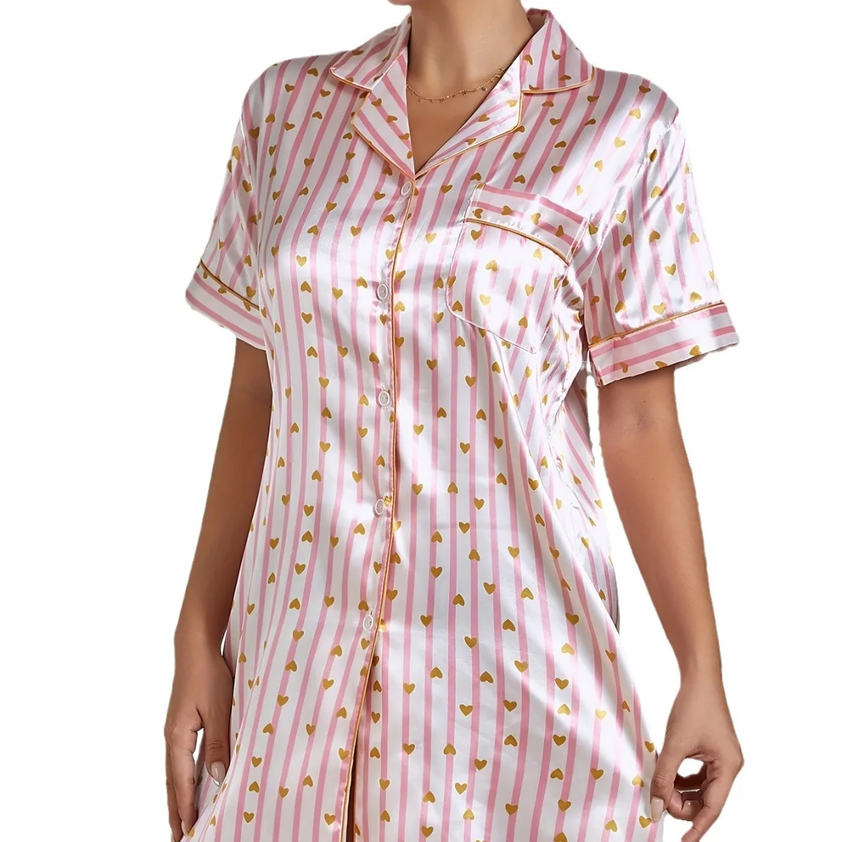 Manga curta cetim feminino listra impressão confortável camisola sleepwear vestido com botões lapela camisa loungewear sleepshirt